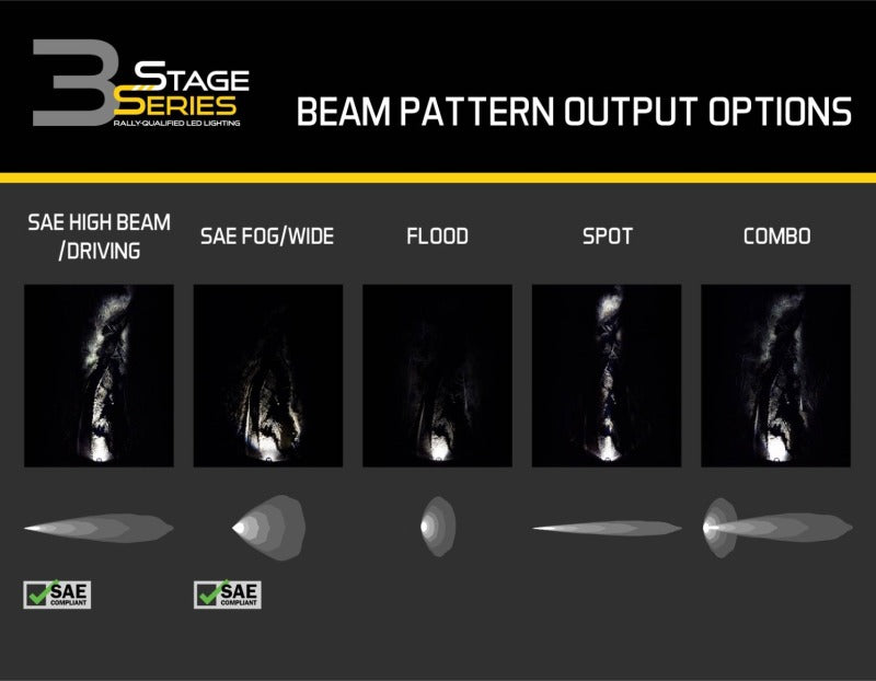 Features Modern TIR optics provide highest intensity on the market Backlight accent feature, in a brilliant amber color Durable powdercoated aluminum construction Integrated Deutsch-style connector Engineered and Assembled in USA Overview Introducing the SS3 3 inch LED Pod! Featuring higher output intensity than any other 3 inch light on the market, these LED pods have been designed for maximum functionality, with custom-engineered TIR optics shining in highly useful beam patterns, all in a durable package. All Stage Series LED pods are available in a cool white or selective yellow color, and sport or pro power levels. Focused. Traditional optics like reflectors or simple lenses lose light internally and to glare, so not all of the light shines on target. Instead, the custom-engineered TIR optic in the SS3 collects all of the light from the LED, and directs it only where you need it, drastically reducing glare and improving total efficiency. The total intensity of the SS3 is much greater than other LED pods using basic optics or reflectors with a standard outer lens. Backlight Functionality. The Stage Series 3" LED Pod is now available with a distinctive backlight, in a brilliant amber color. The SS3's backlight fully illuminates the TIR optic, providing a more unique and modern look than the small indicator LEDs found in other products. Simple connections. All SS3 LED pods feature a custom-molded DT type Deutsch-style connector on the back, and come with a 6-inch pigtail with bare leads.