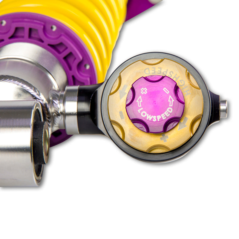 Using the Nordschleife as it's testing grounds and the 7-post rig, KW developed it's V4 Clubsport coilover kit. Wheel loads, vehicle weight and chassis reinforcements (increased body stiffness) can all be taken into consideration with Adjustment -capabilities of the V4 Clubsport. The KW Clubsport coilovers combine KW's high-end racing technology -with maintenance-free KW OEM quality components. Designed to provide you the ideal product to utilize the full potential of your sports car during autocross, track days, high performance drivers education (HPDE) courses, club racing, and is tested rigorously on race tracks such as the Nurburgring Nordschleife. Race teams rely on KW's racing expertise and experience for their vehicle setup. This same championship winning pedigree is mirrored in the development of each one of the KW Clubsport coilover systems. Similar to the KW Competition suspension used in international motorsports, the KW V4 Clubsport coilover kit allows fine tuning of the compression damping separately in the low-speed and high-speed range. The click adjustments of the TVCLH-A valve technology -ake for easy Adjustment -directly on the reservoir. You can modify the low-speed compression damping with 6 precise clicks with the purple low speed Adjustment -ial and directly beneath it the golden Adjustment -heel provides an additional 14 precise clicks of high speed compression adjustment. In addition, the TVR-A technology -provides 16 clicks to noticeably adjust the rebound damping independently of the compression damping. If you would like to adjust the KW V4 Clubsport coilover kit it can easily be adjusted for more comfort or to an alternative setup for a new race track. The KW V4 Clubsport benefits from the same motorsports technology -hat has proven its endurance with multiple overall wins at the ADAC Zurich 24h Nurburgring race.