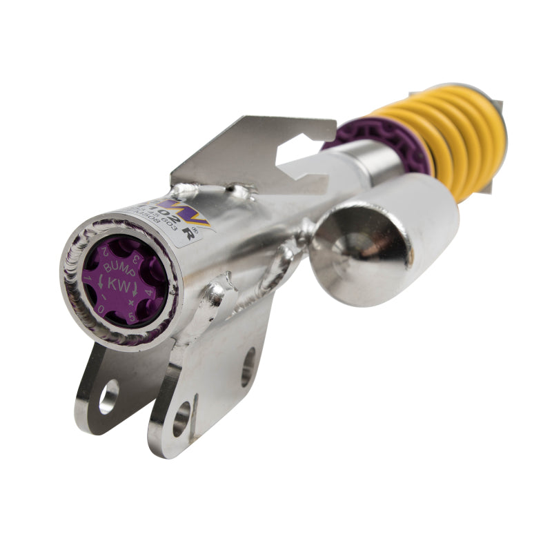 Cutting-edge motorsports technology for more performance on the road. Like every suspension product developed by KW automotive, the suspension manufacturer, and manufactured in Germany, the KW V3 Coilover suspension kit also provides a significant plus in safety reserves in road traffic. Thanks to the chassis with its high-quality dampers, springs, and elastomer spring elements, pitching and rolling movements during load changes such as evasive maneuvers, cornering, acceleration, and braking are significantly reduced. The braking distances are also shortened. Thanks to improved support and feedback, drivers not only feel safer but driving in everyday life becomes even safer. With compression and rebound stage damping, that can be set separately and independently of each other, the damper setup can be customized to your personal driving preferences or vehicle changes such as weight, tire characteristics, or altered vehicle rigidity. True performance optimization is only possible with this unique, patented system. For example, this allows the compression damping force to be increased and get more grip from the tires, to improve cornering behavior and reduce squat without simultaneously altering the rebound stage damping which is optimally matched to the spring rate, a scenario which results in reduced grip and the associated loss of performance. The KW V3 coilover kit is the ideal tool for performance-oriented drivers and experienced tuning enthusiasts who place a strong emphasis on the overall performance of their suspension. The Variant 3 features patented TVR-A and TVC-A technology that provides separately adjustable rebound and compression damping. The extensive adjustment range of the independ ently configurable rebound and compression make it easy to directly influence the steering behavior, directional stability, grip and handling characteristics for confident and repeatable results at the limit of driving dynamics.