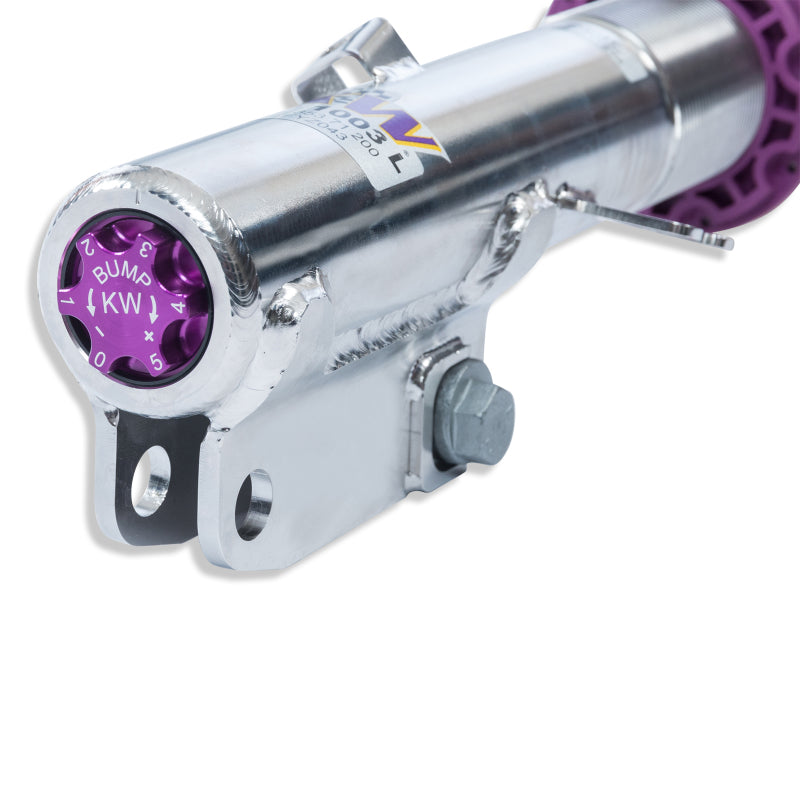 Cutting-edge motorsports technology for more performance on the road. Like every suspension product developed by KW automotive, the suspension manufacturer, and manufactured in Germany, the KW V3 Coilover suspension kit also provides a significant plus in safety reserves in road traffic. Thanks to the chassis with its high-quality dampers, springs, and elastomer spring elements, pitching and rolling movements during load changes such as evasive maneuvers, cornering, acceleration, and braking are significantly reduced. The braking distances are also shortened. Thanks to improved support and feedback, drivers not only feel safer but driving in everyday life becomes even safer. With compression and rebound stage damping, that can be set separately and independently of each other, the damper setup can be customized to your personal driving preferences or vehicle changes such as weight, tire characteristics, or altered vehicle rigidity. True performance optimization is only possible with this unique, patented system. For example, this allows the compression damping force to be increased and get more grip from the tires, to improve cornering behavior and reduce squat without simultaneously altering the rebound stage damping which is optimally matched to the spring rate, a scenario which results in reduced grip and the associated loss of performance. The KW V3 coilover kit is the ideal tool for performance-oriented drivers and experienced tuning enthusiasts who place a strong emphasis on the overall performance of their suspension. The Variant 3 features patented TVR-A and TVC-A technology that provides separately adjustable rebound and compression damping. The extensive adjustment range of the independently configurable rebound and compression make it easy to directly influence the steering behavior, directional stability, grip and handling characteristics for confident and repeatable results at the limit of driving dynamics.