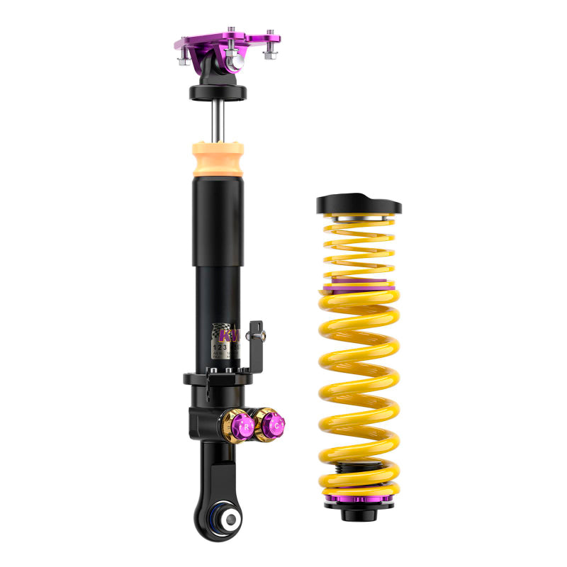 With the new KW V5 Clubsport coilover suspension, KW focuses on its successful motorsport suspension technology with KW Solid Piston Technology and modular design with damper valves connected in series. The KW V5 Clubsport assures precise and fast damping without delay. The shock absorbers and valves react directly, even with small spring travel, minimal steering movements, and minor road undulations. Every driving maneuver and input, such as those generated during braking, acceleration, steering, load changes, and undulations, are damped much more precisely. The KW Solid Piston dampers provide much more platform support to the chassis than conventional dampers and, depending on the vehicle allow for lower spring rates to be used. The KW V5 Clubsport with adjustable KW SPCLH-A (KW Solid Piston Compression Low- and Highspeed Adjustable) compression damping and KW SPRLH-A (KW Solid Piston Rebound Low- and Highspeed Adjustable) rebound damping offer significant added value: more sensitive damping, cavitation-free function, precise high-frequency damping, low-pressure gas range from 6 to 10 bar and low hysteresis. The valve units in the KW V5 Clubsport coilover suspension, which are built-in series with different valve spring types and main valves, offering the freedom to individually adjust the compression and rebound damping with 13 exact clicks (14 characteristic curves) each in the low- and high-speed range. The KW Solid Piston Technology can also be used to cover a large force range when designing the characteristic curves; all the more reason to enable a completely new type of harmonious damping. The KW V5 Clubsport coilovers feature our signature purple anodized KW Clubsport aluminum uniball solid top mounts for increased steering precision. Dial in a maximum or individual lowering within the tested adjustment range. Due to the dirt-resistant trapezoidal thread and the polyamide threaded ring, the continuous lowering can be adjusted quickly and easily.